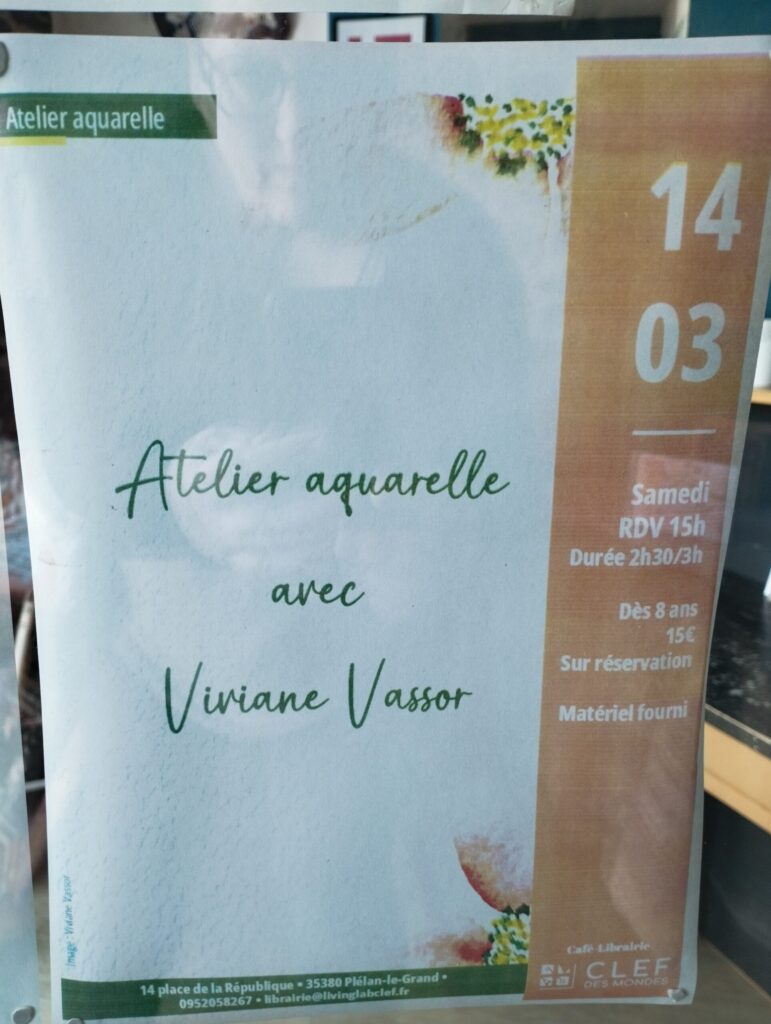 Venez retrouver Viviane VASSOR, qui vous propose un atelier aquarelle, le samedi 14 mars 2026 à 15h. Pensez à vous inscrire, 15€, dès 8 ans, matériel fourni.