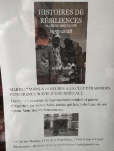 Le mardi 17 mars à 19h à la clef des mondes, venez assistez à une conférence suivie d’une dédicace sur le thème « Les camps de regroupement pendant la guerre d’Algérie », par Sylvie Aditi, autrice qui fera la dédicace de son roman « Histoire de résiliences, Algérie – Bretagne, 1955 – 2028 ».