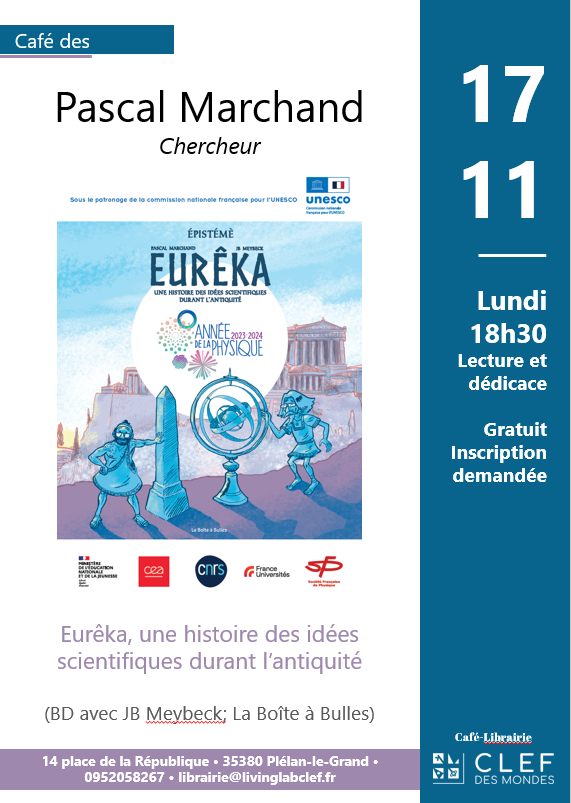 Le Lundi 17 novembre à 18h30, ne manquez pas la lecture dédicace de Pascal MARCHAND, chercheur pour son ouvrage « Eurêka, une histoire des idées scientifiques durant l’antiquité. pensez à vous inscrire les places sont limitées.